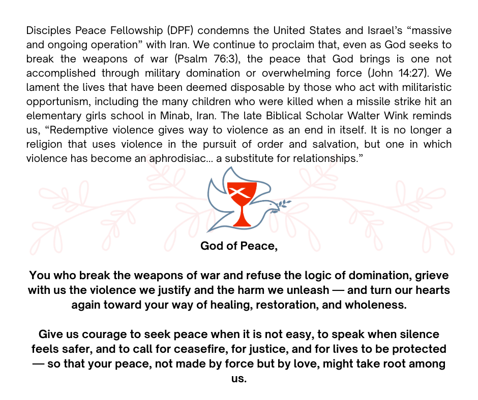 As leaders, members and friends of the Disciples Peace Fellowship, we mourn and rage over the recent violence in Gaza, the West Bank, and Israel. We lament each life lost and every heart traumatized by this violence. We condemn the attempted expulsions of Palestinian families in the Sheikh Jarrah neighborhood of East Jerusalem. We deplore the attacks on worshipers at the Al Aqsa Mosque. We reject the cynicism that arises from realizing how much this current suffering is rooted in cold-hearted, political maneuvering by leaders desperate to hold onto power. And we name that these provocations were not the beginning of this conflict.